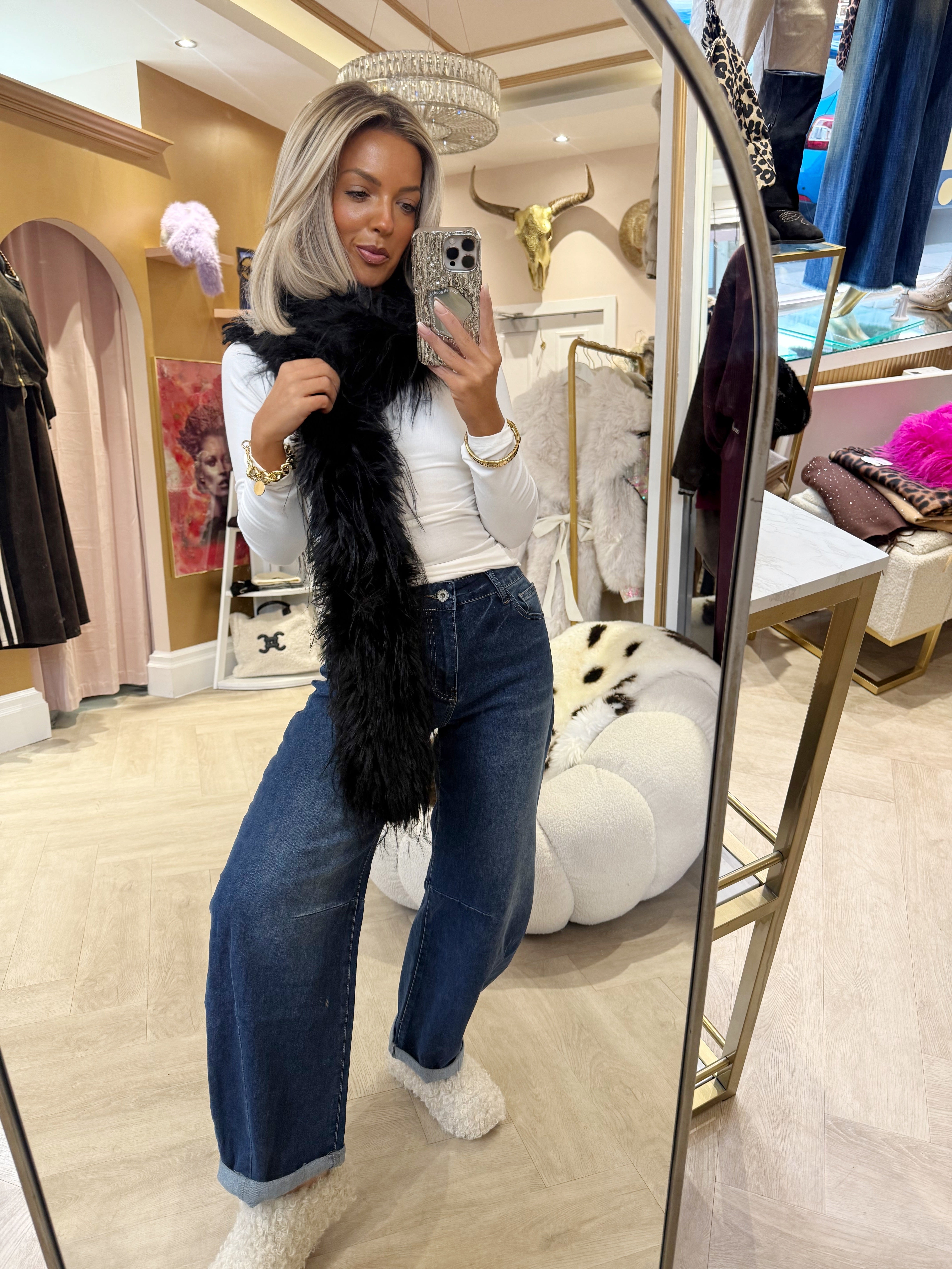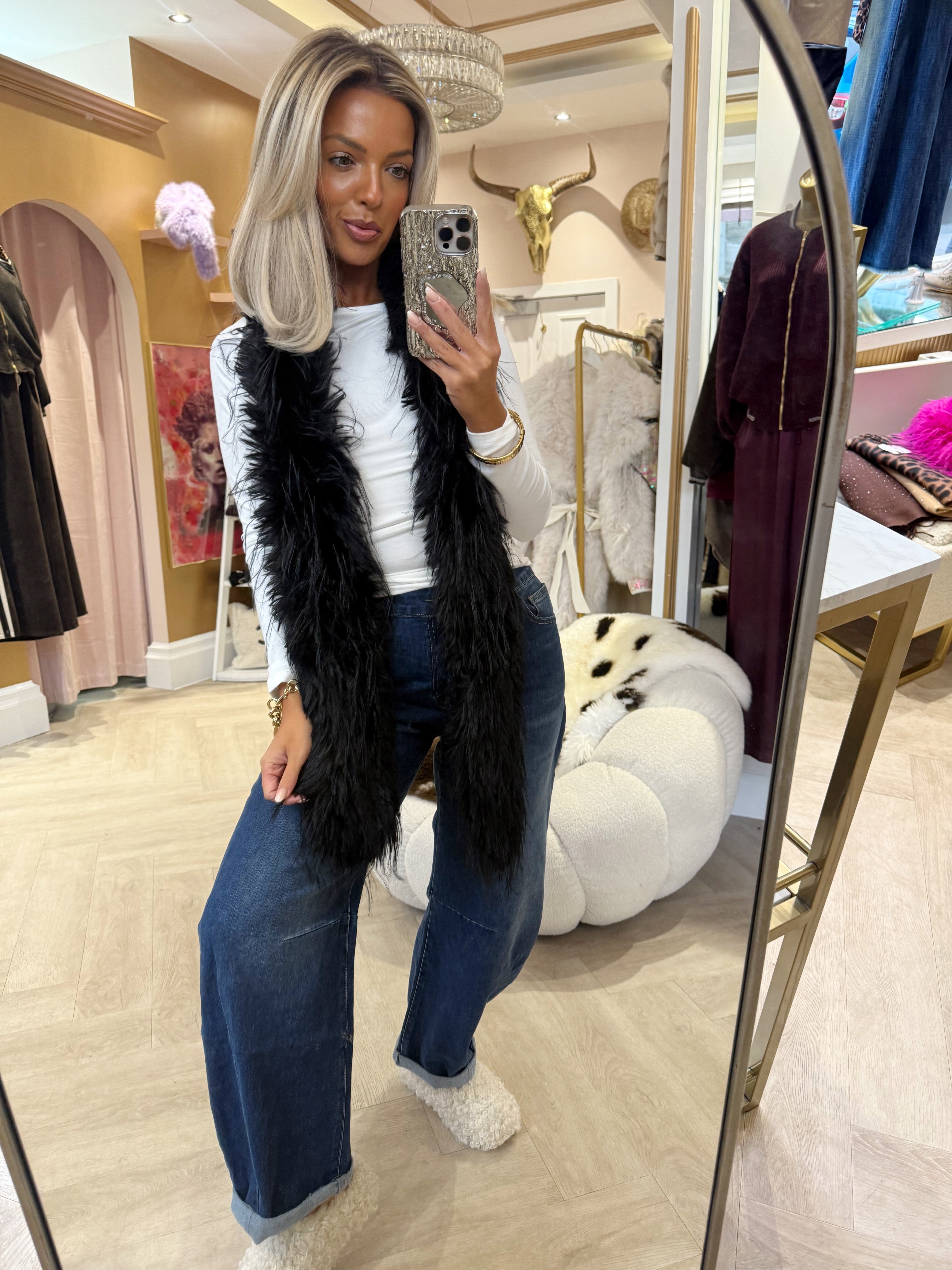 Black Ostrich long scarf is backordered and will ship as soon as it is back in stock.