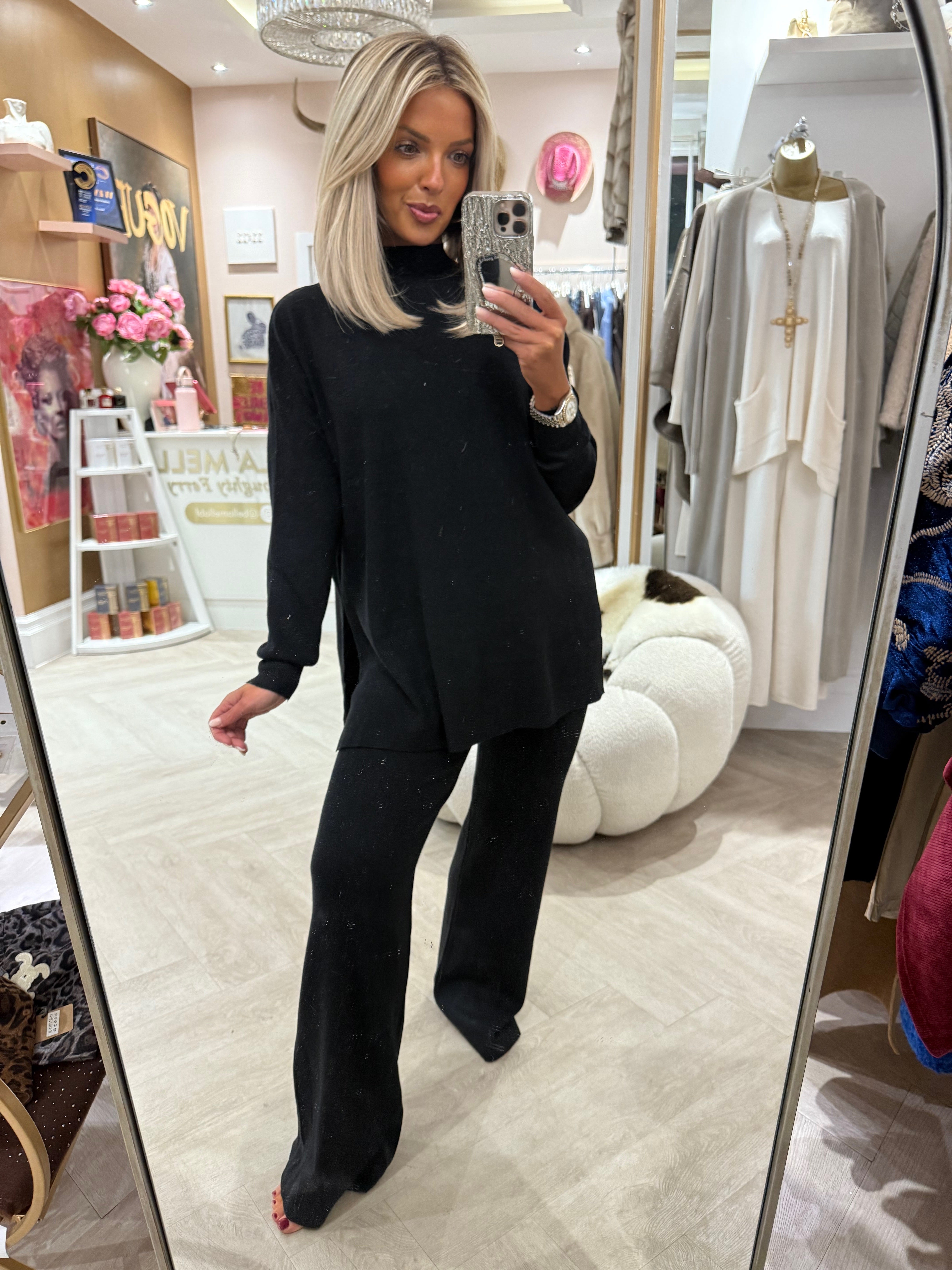 High neck knit set is backordered and will ship as soon as it is back in stock.