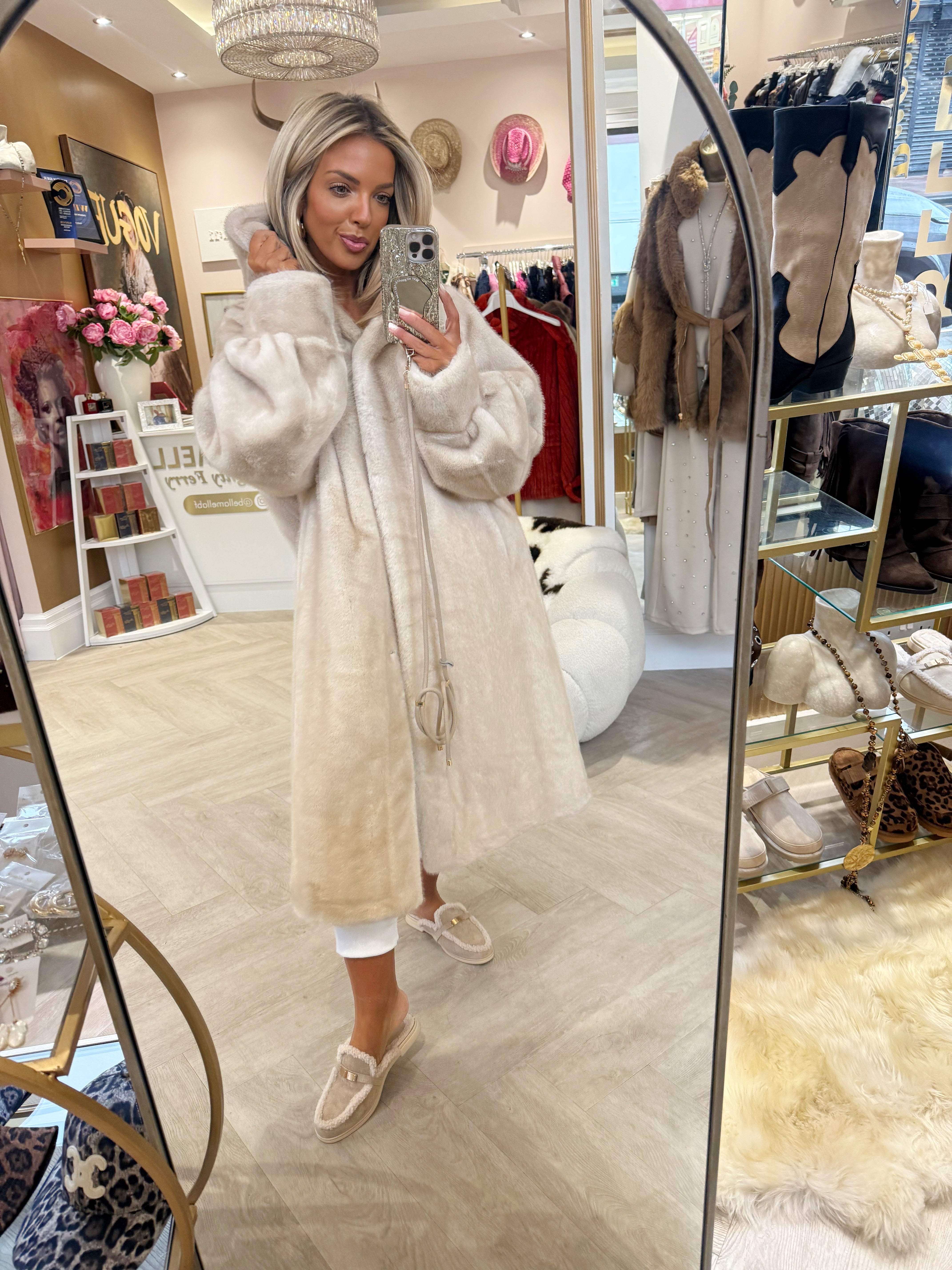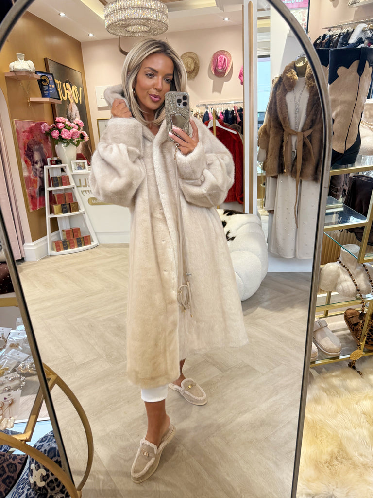 Cream Premium Hooded Faux Fur coat is backordered and will ship as soon as it is back in stock.