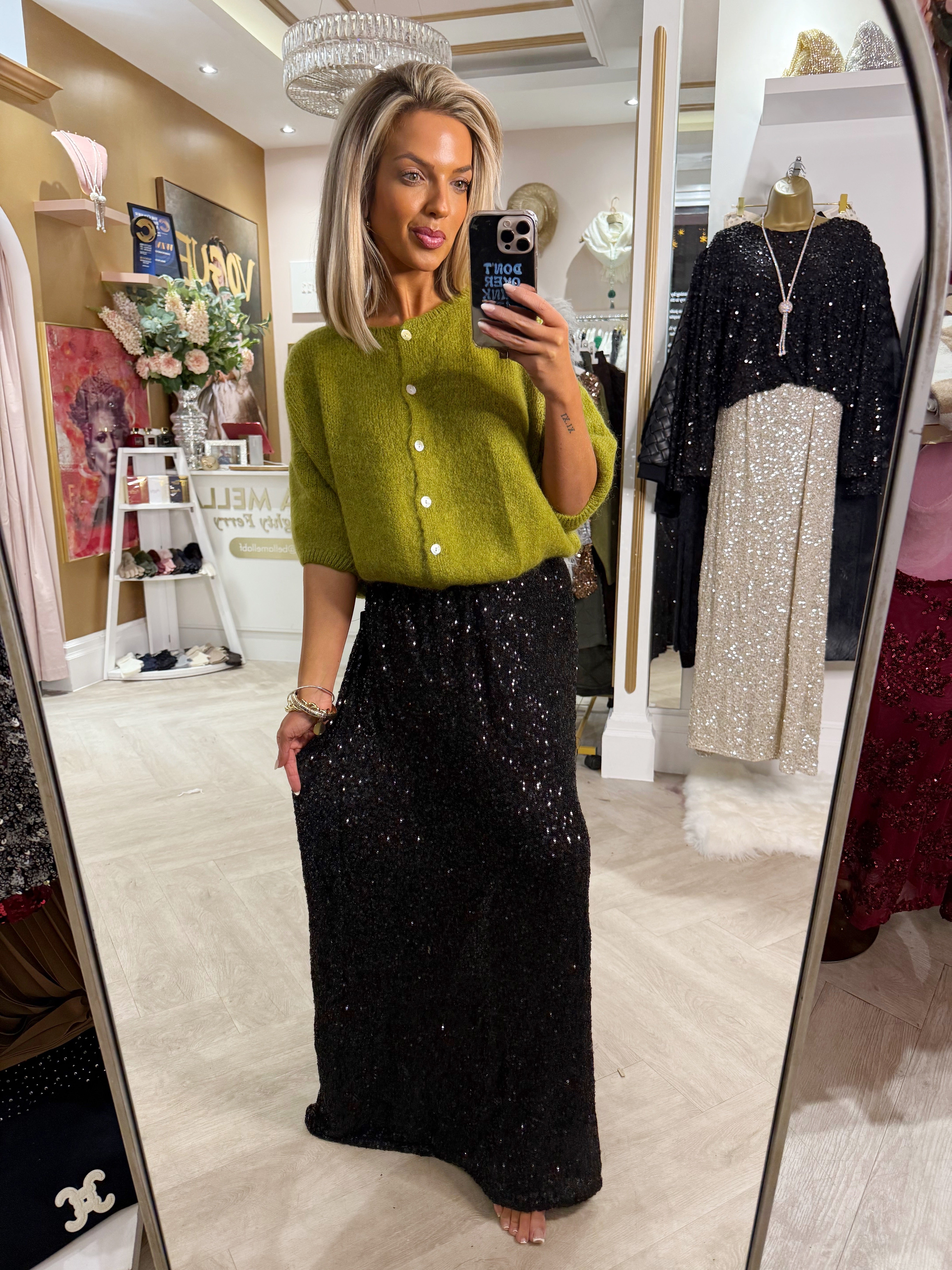 Black full sequin skirt is backordered and will ship as soon as it is back in stock.