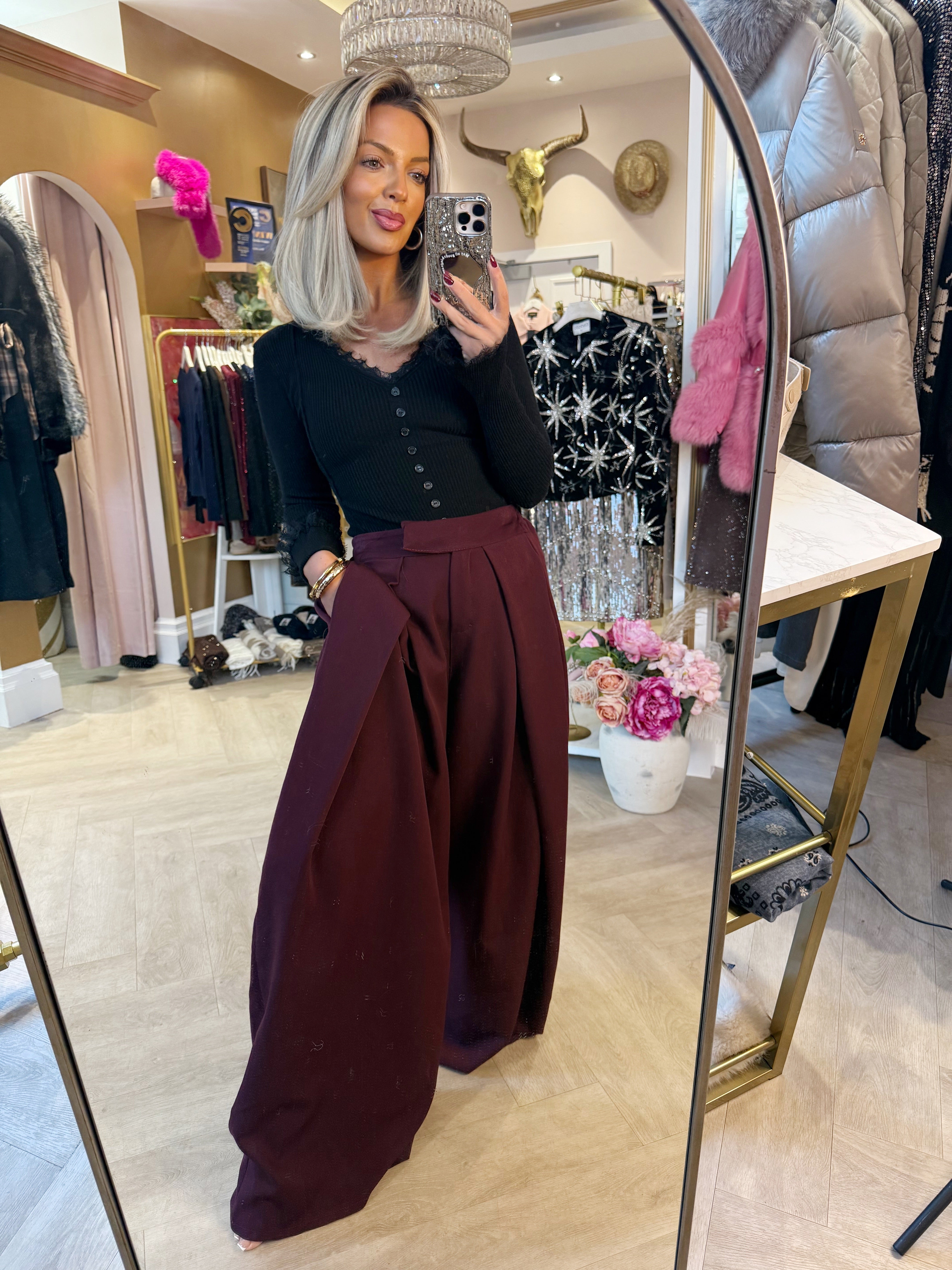 Burgundy Long wide leg trouser is backordered and will ship as soon as it is back in stock.