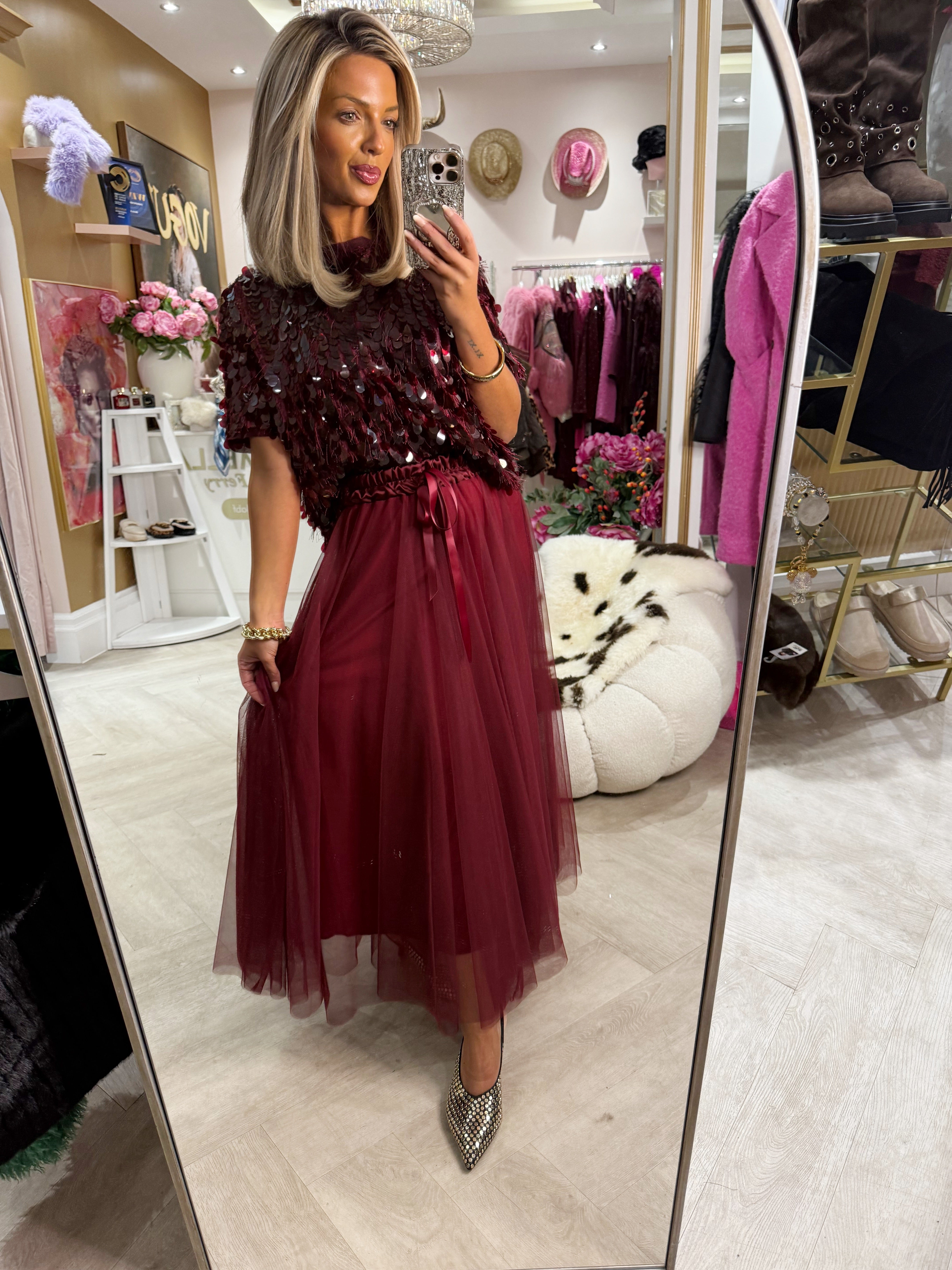 Burgundy tulle skirt is backordered and will ship as soon as it is back in stock.
