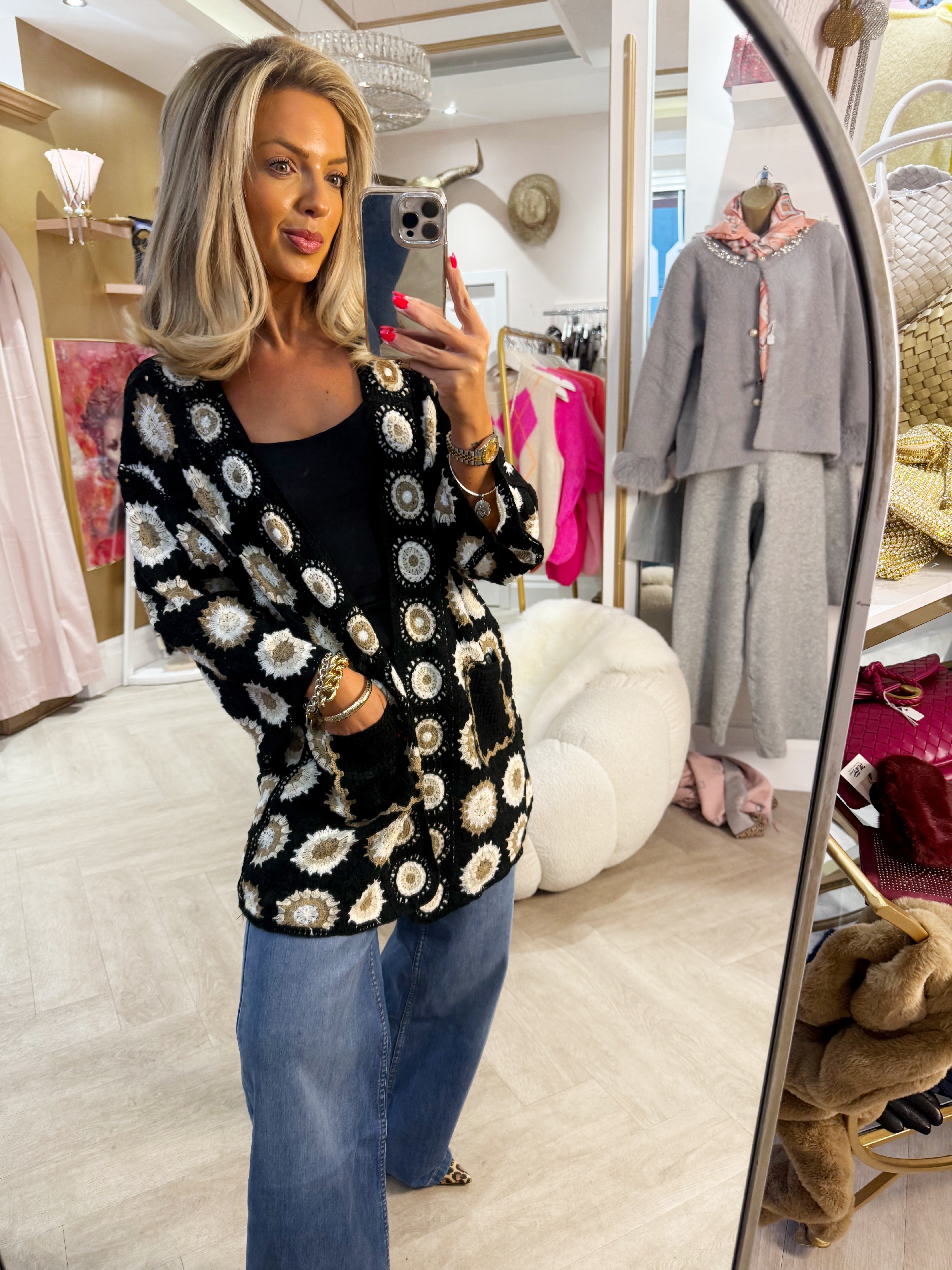 Black crochet cardigan is backordered and will ship as soon as it is back in stock.