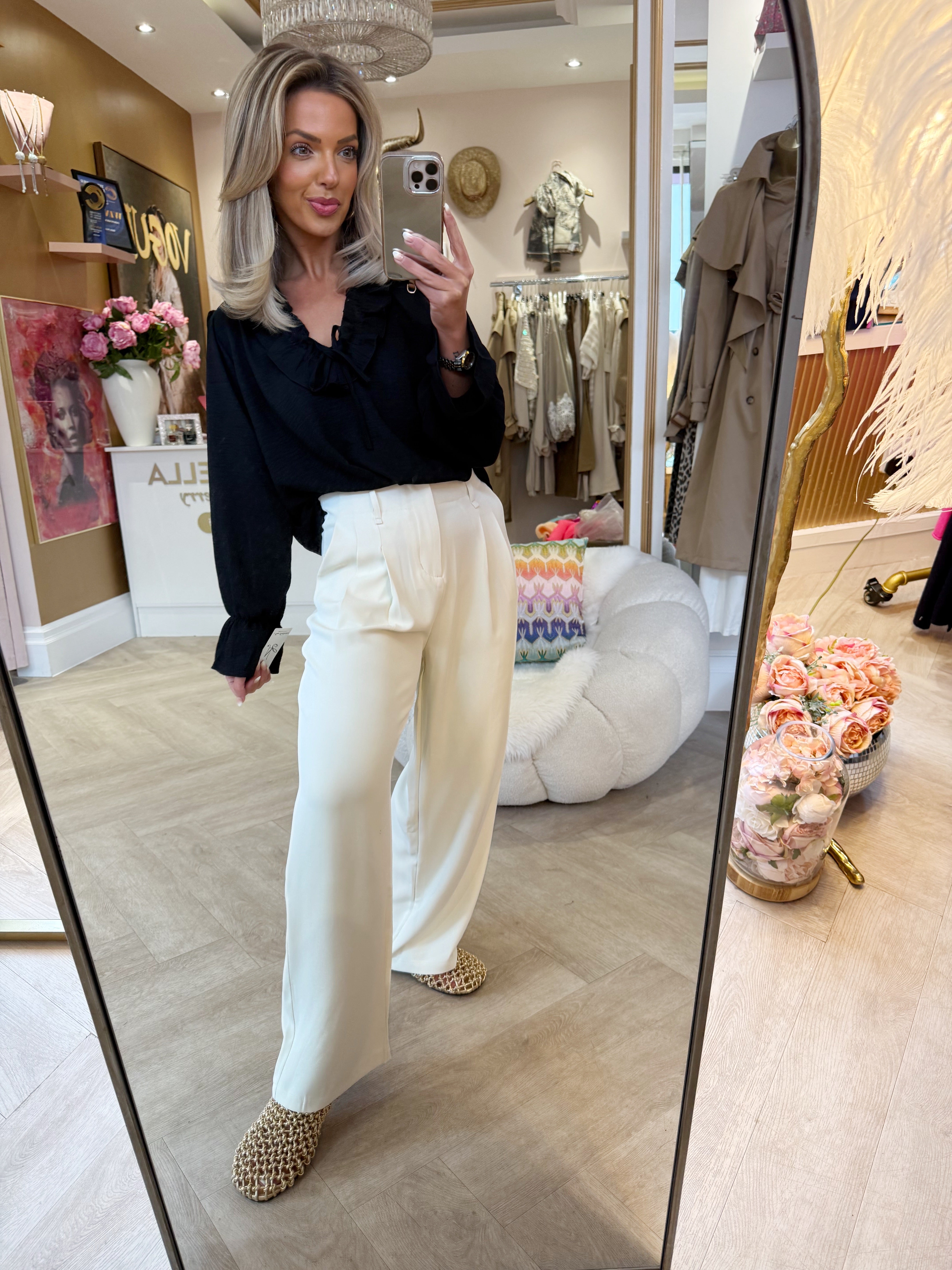 Black Ruffle blouse is backordered and will ship as soon as it is back in stock.