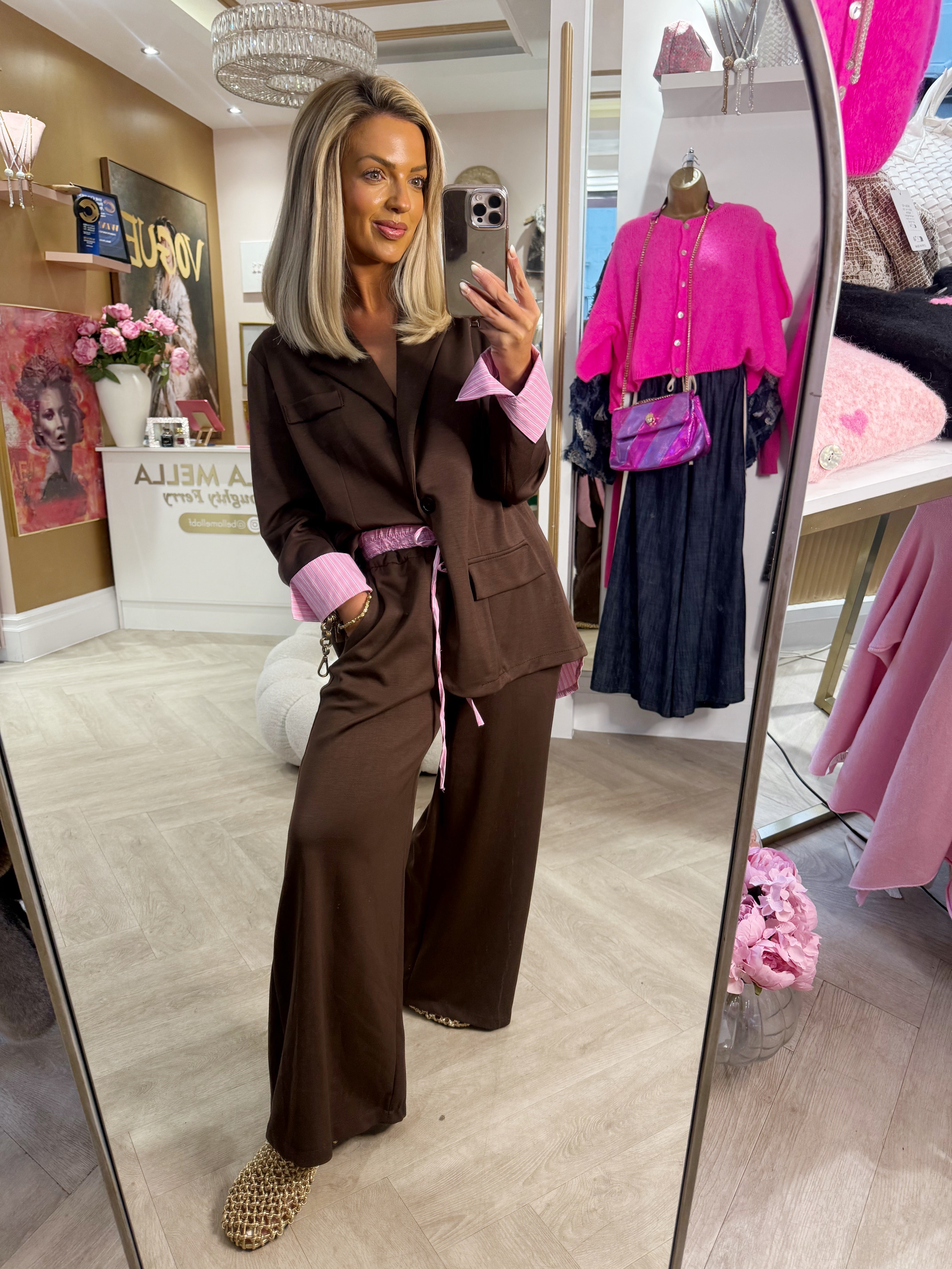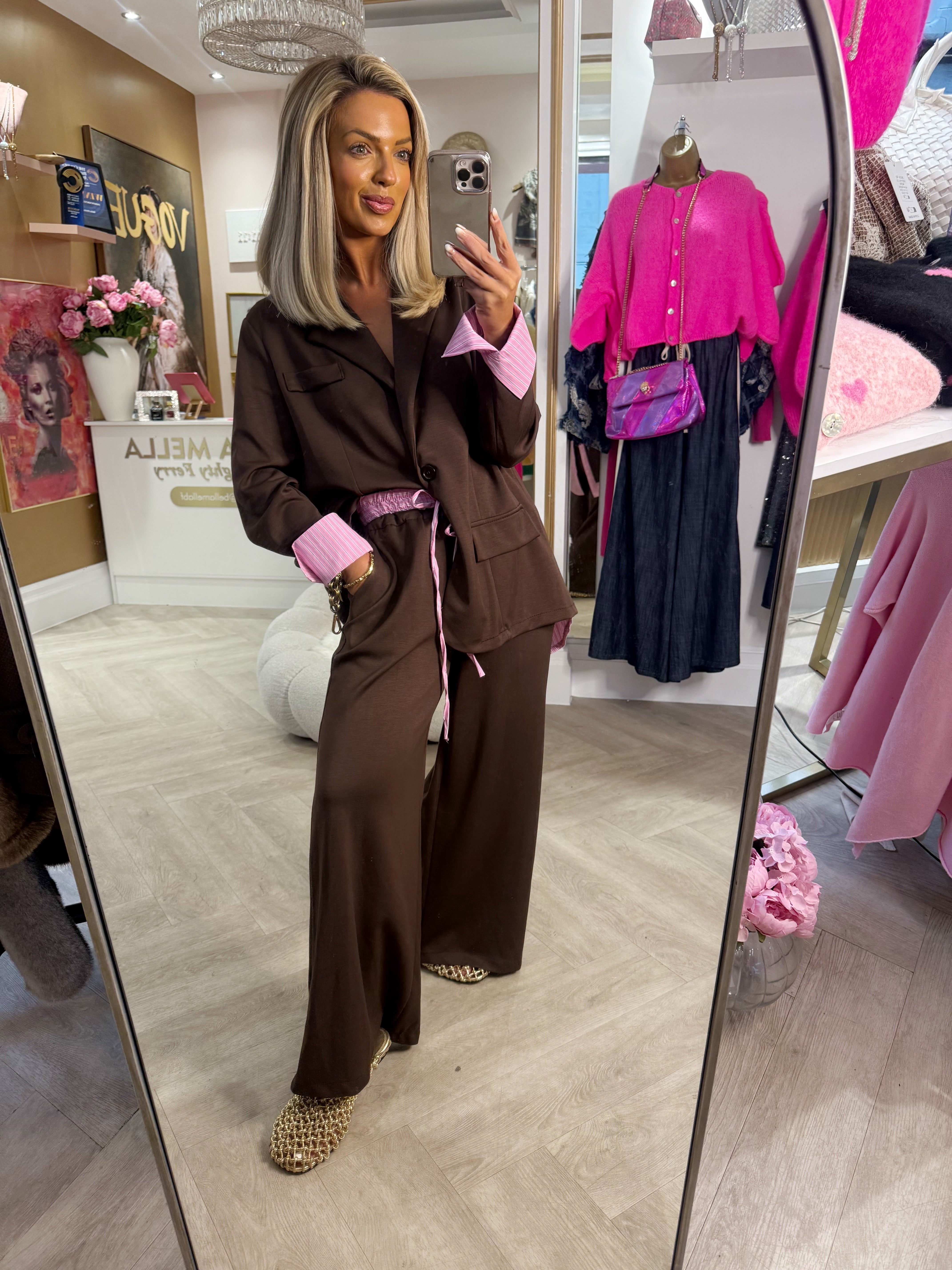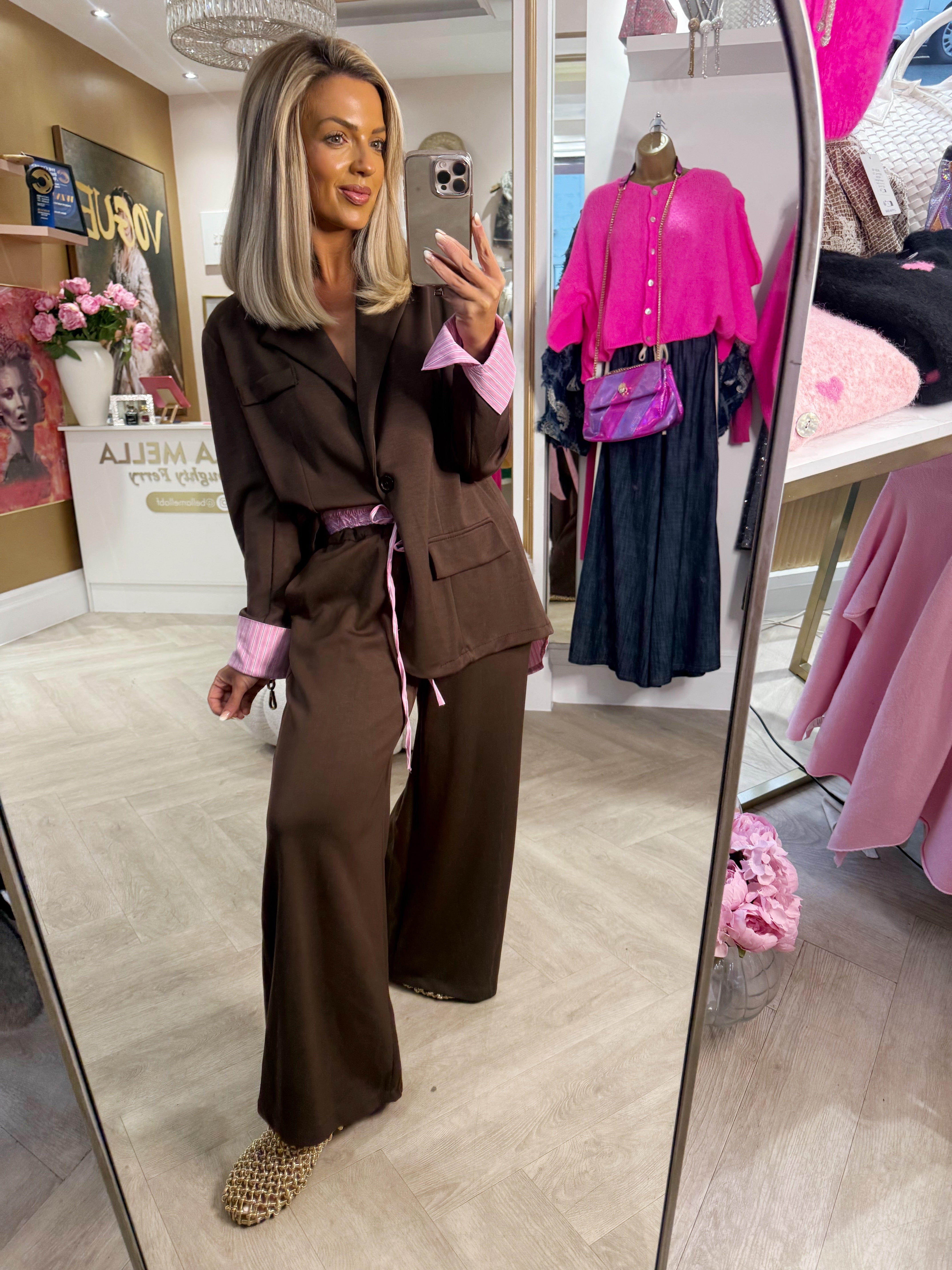 Brown soft touch blazer twin set is backordered and will ship as soon as it is back in stock.