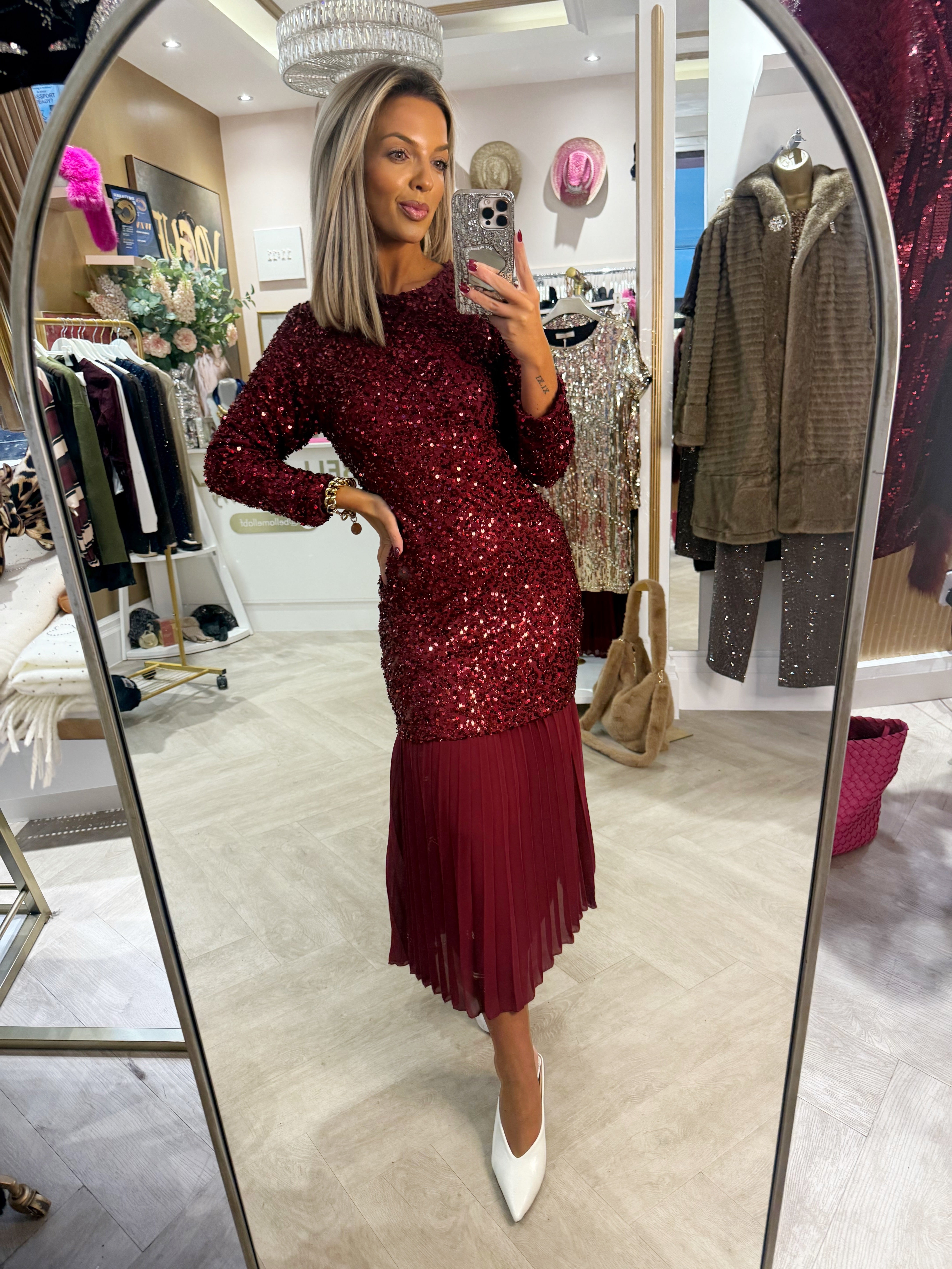 Burgundy sequin pleated dress is backordered and will ship as soon as it is back in stock.