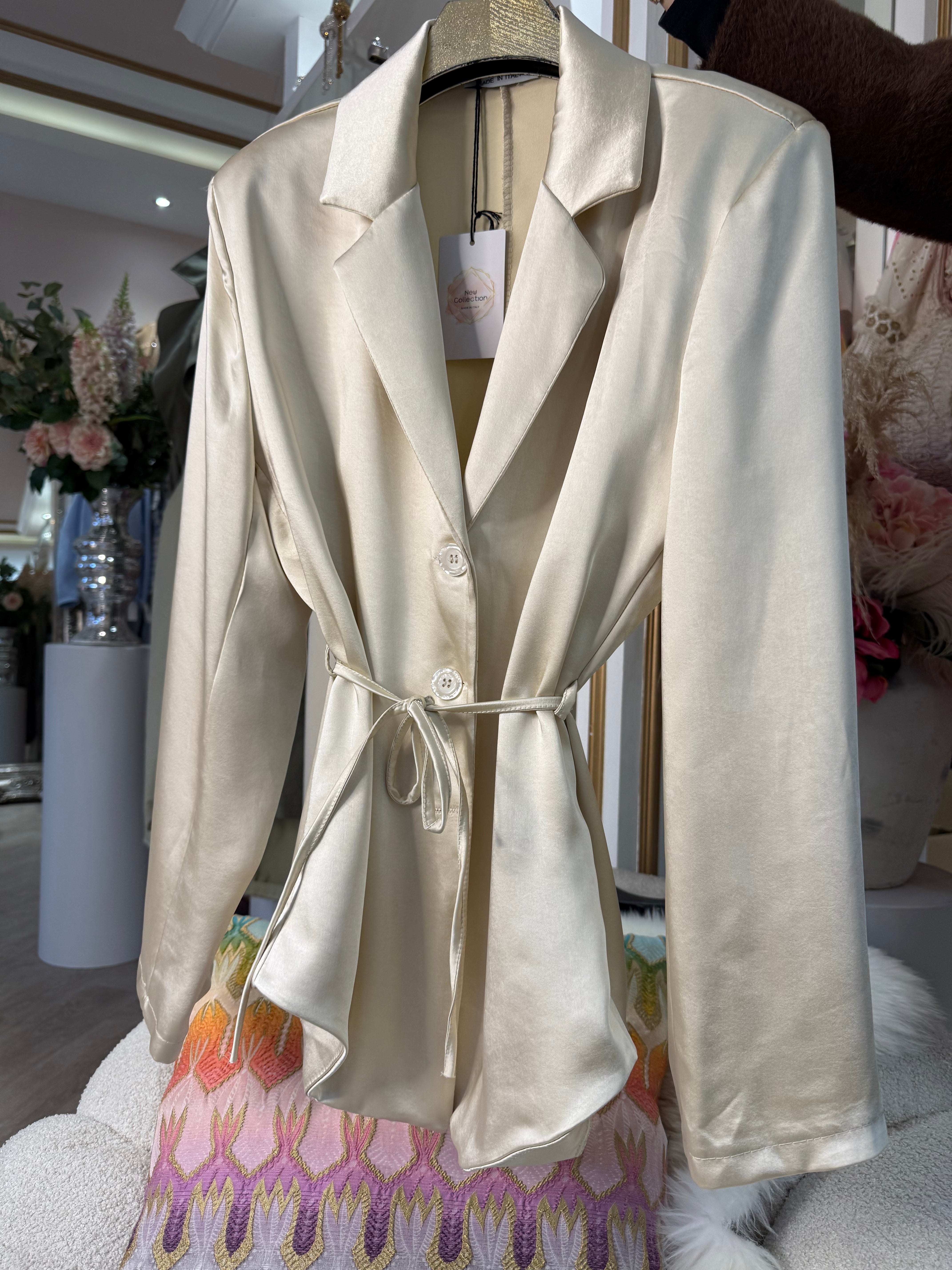 Champagne Silkette blazer top is backordered and will ship as soon as it is back in stock.
