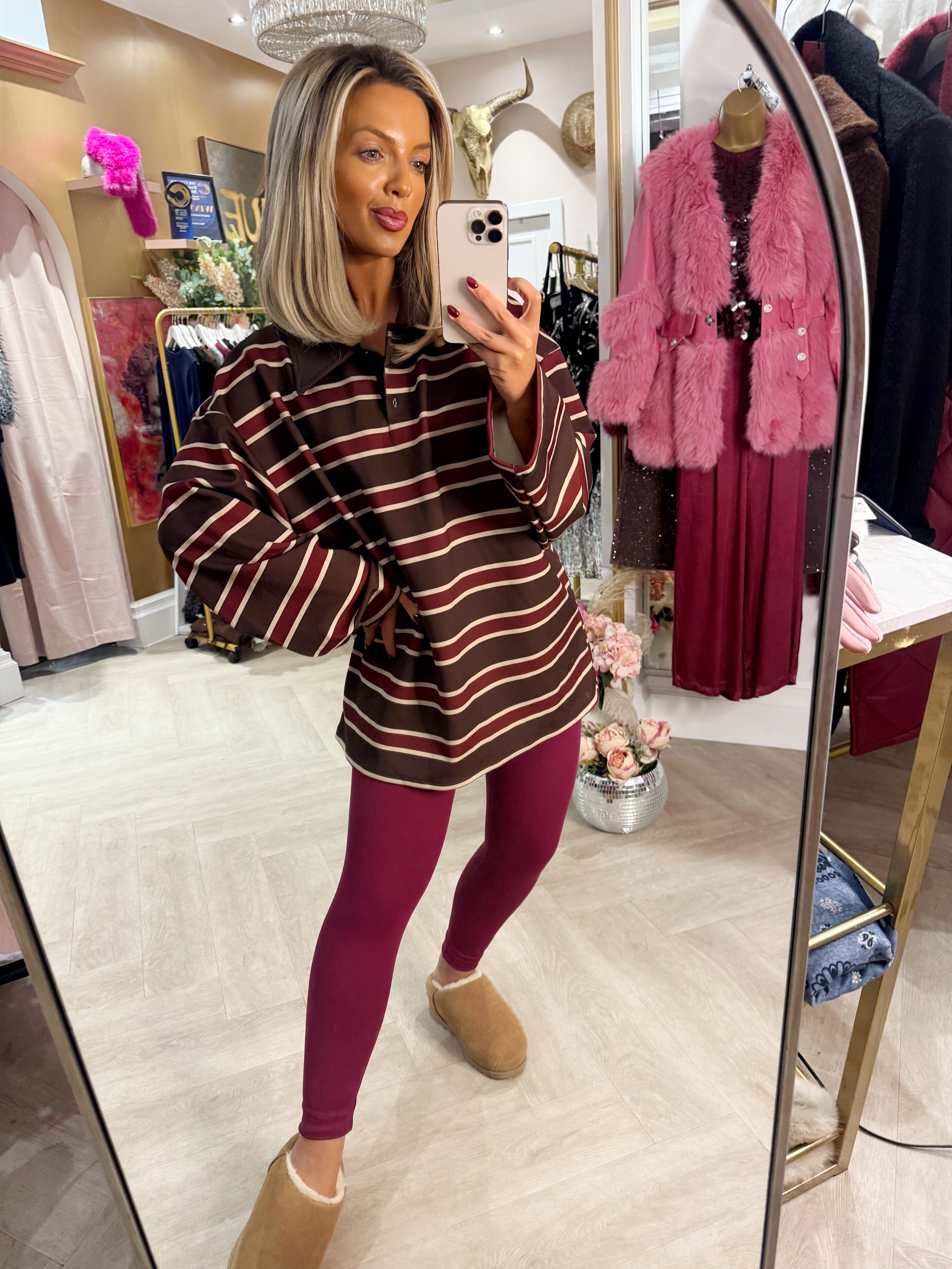 Chocolate Luxe striped sweat is backordered and will ship as soon as it is back in stock.