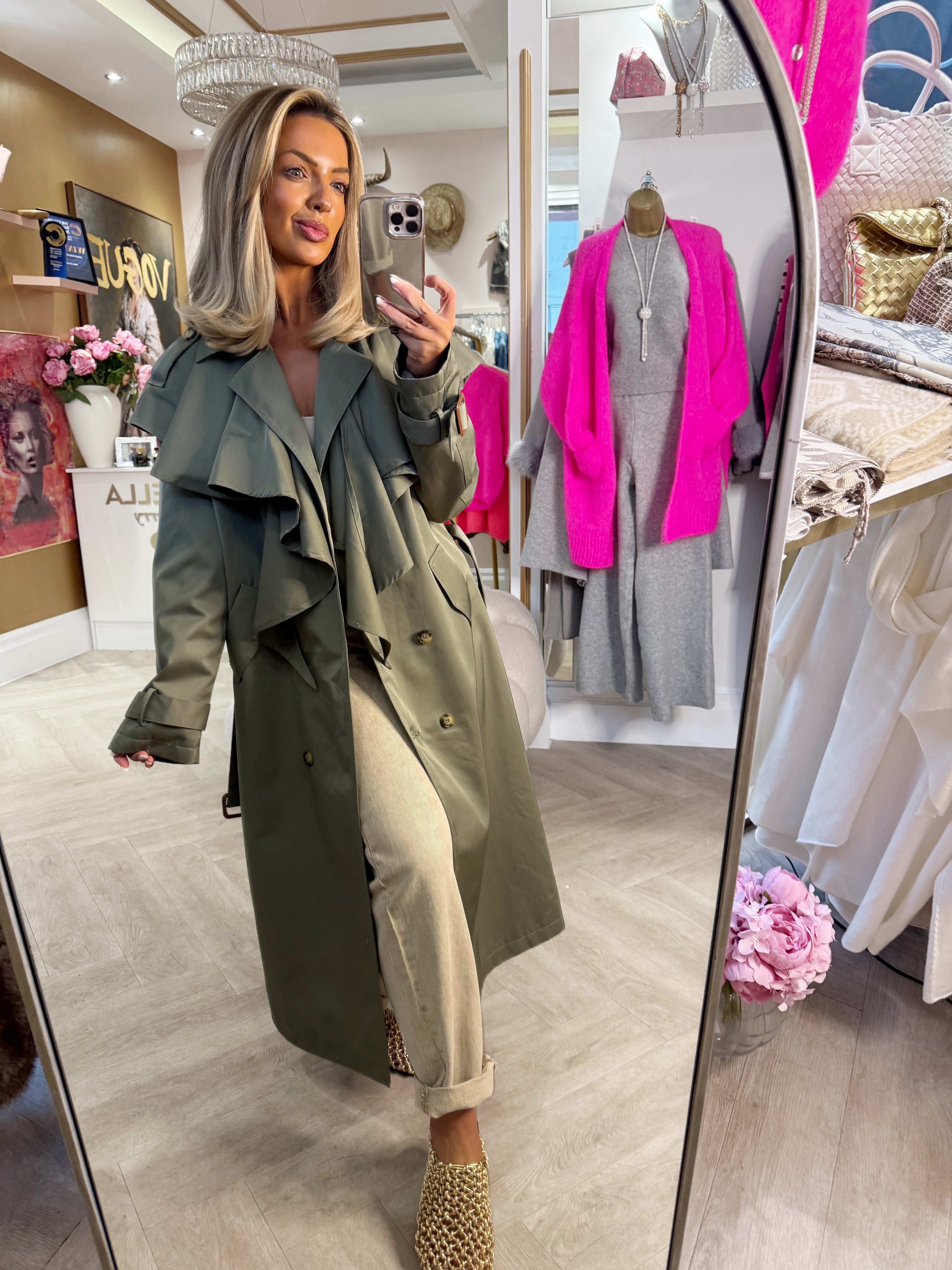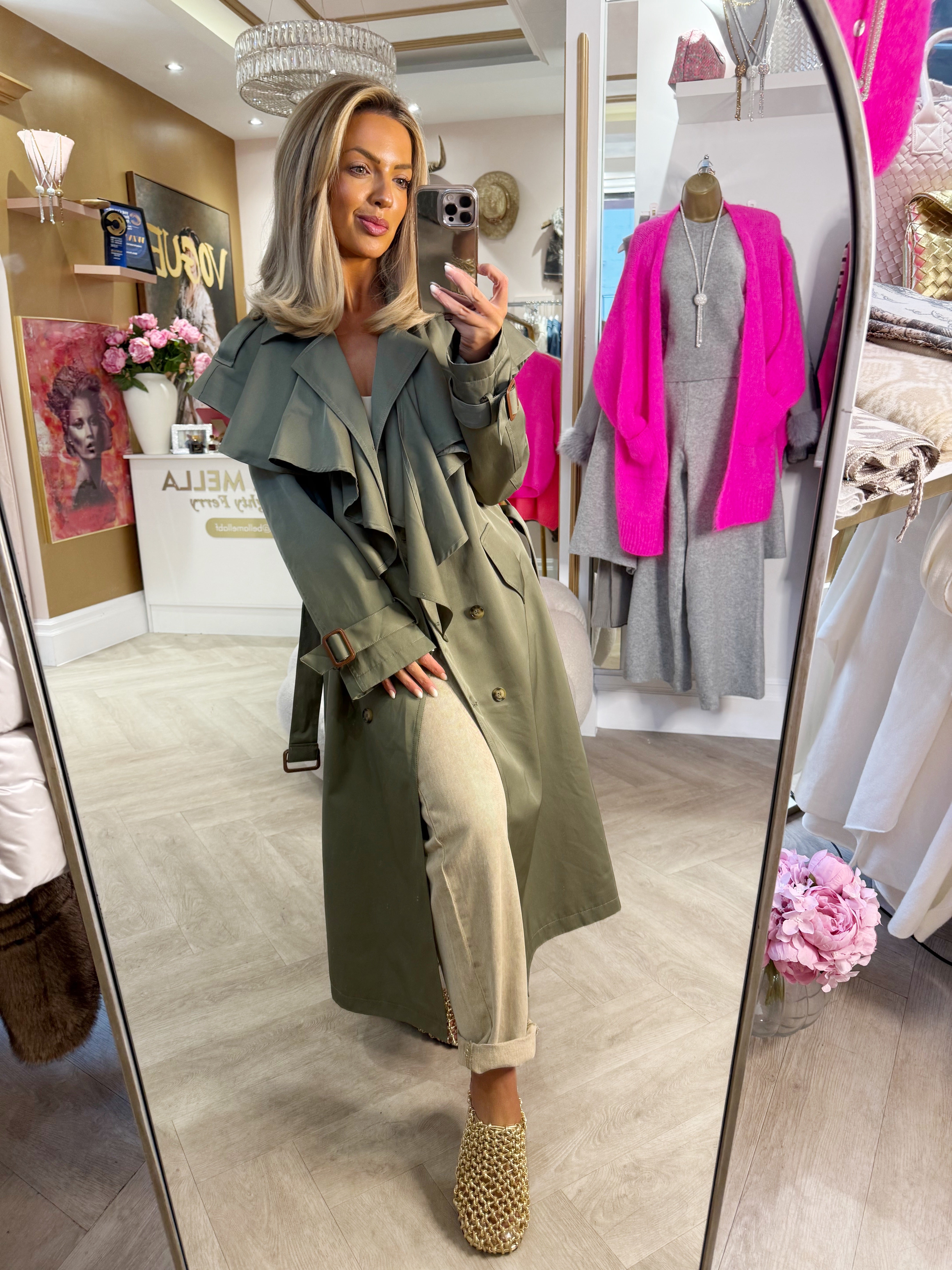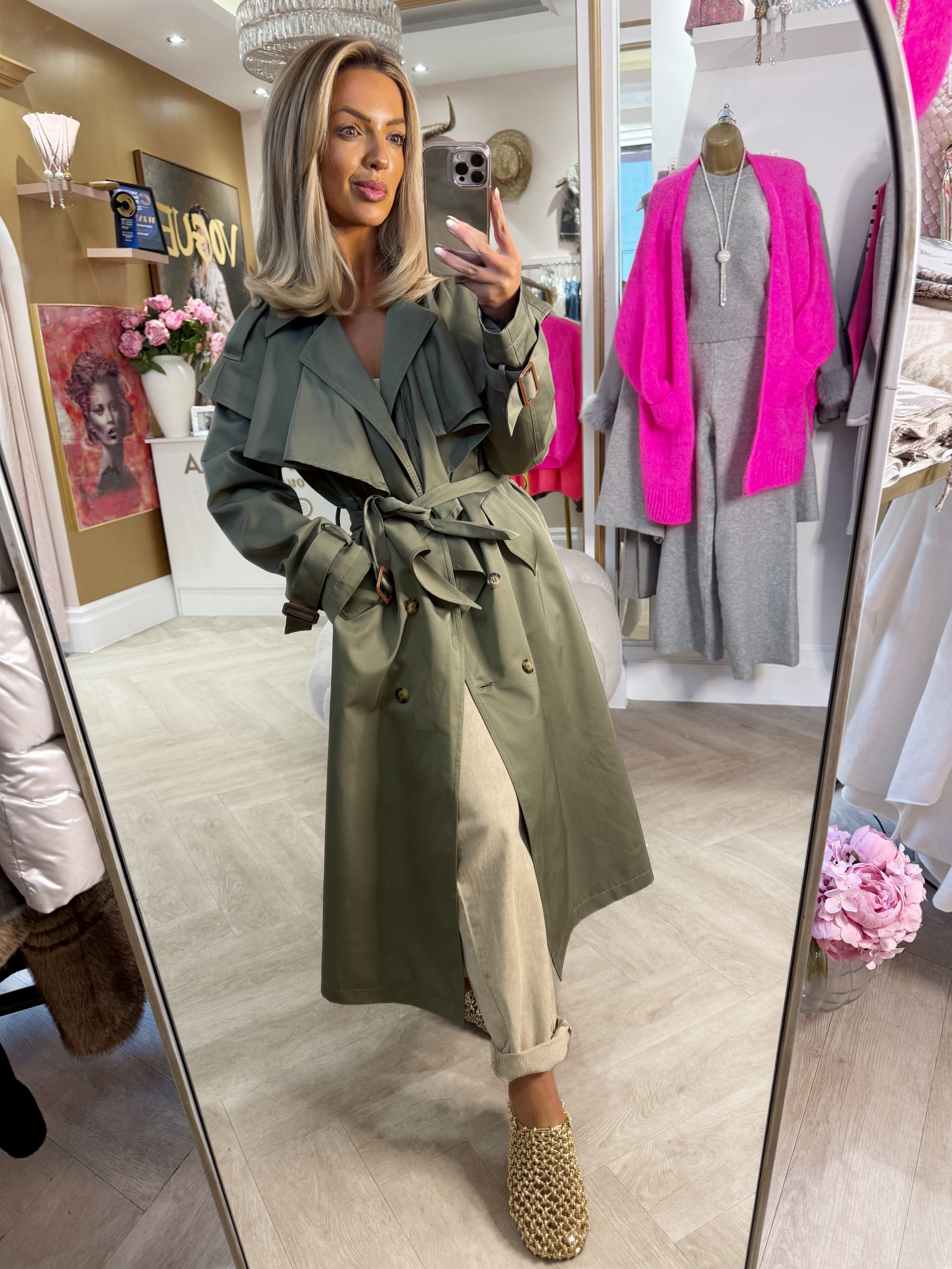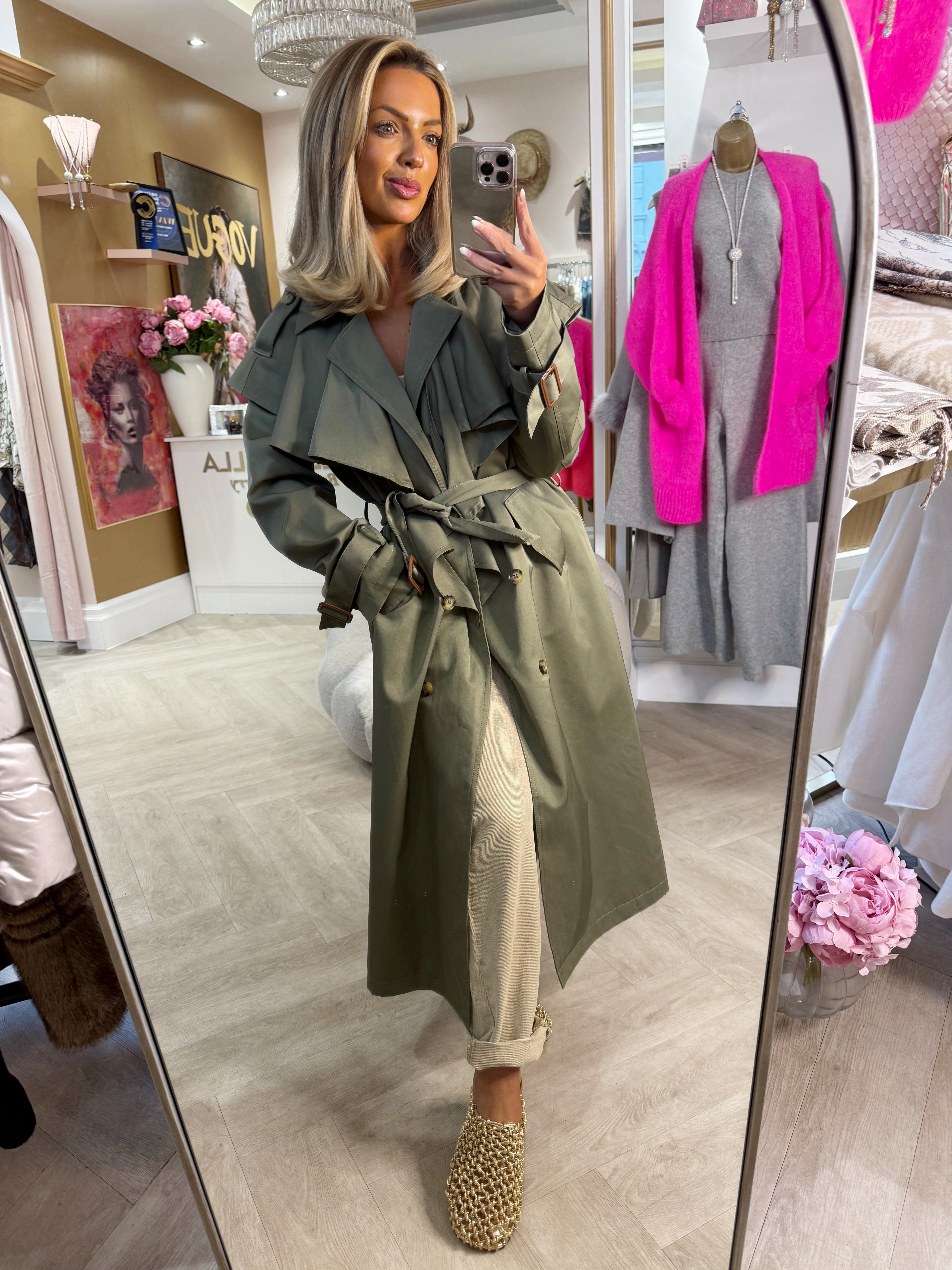 Khaki long luxe trench coat is backordered and will ship as soon as it is back in stock.