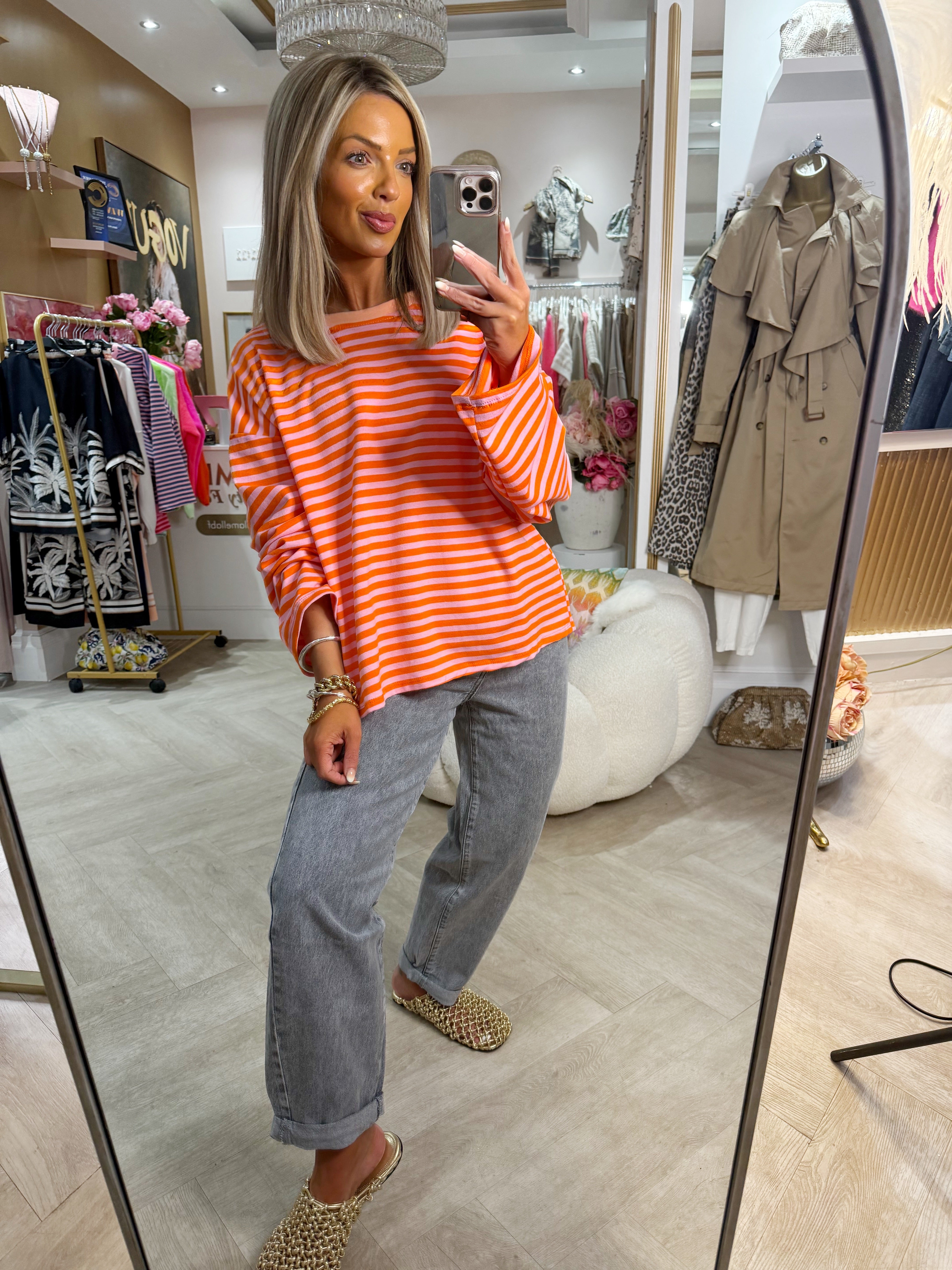 Orange/pink long sleeve top is backordered and will ship as soon as it is back in stock.