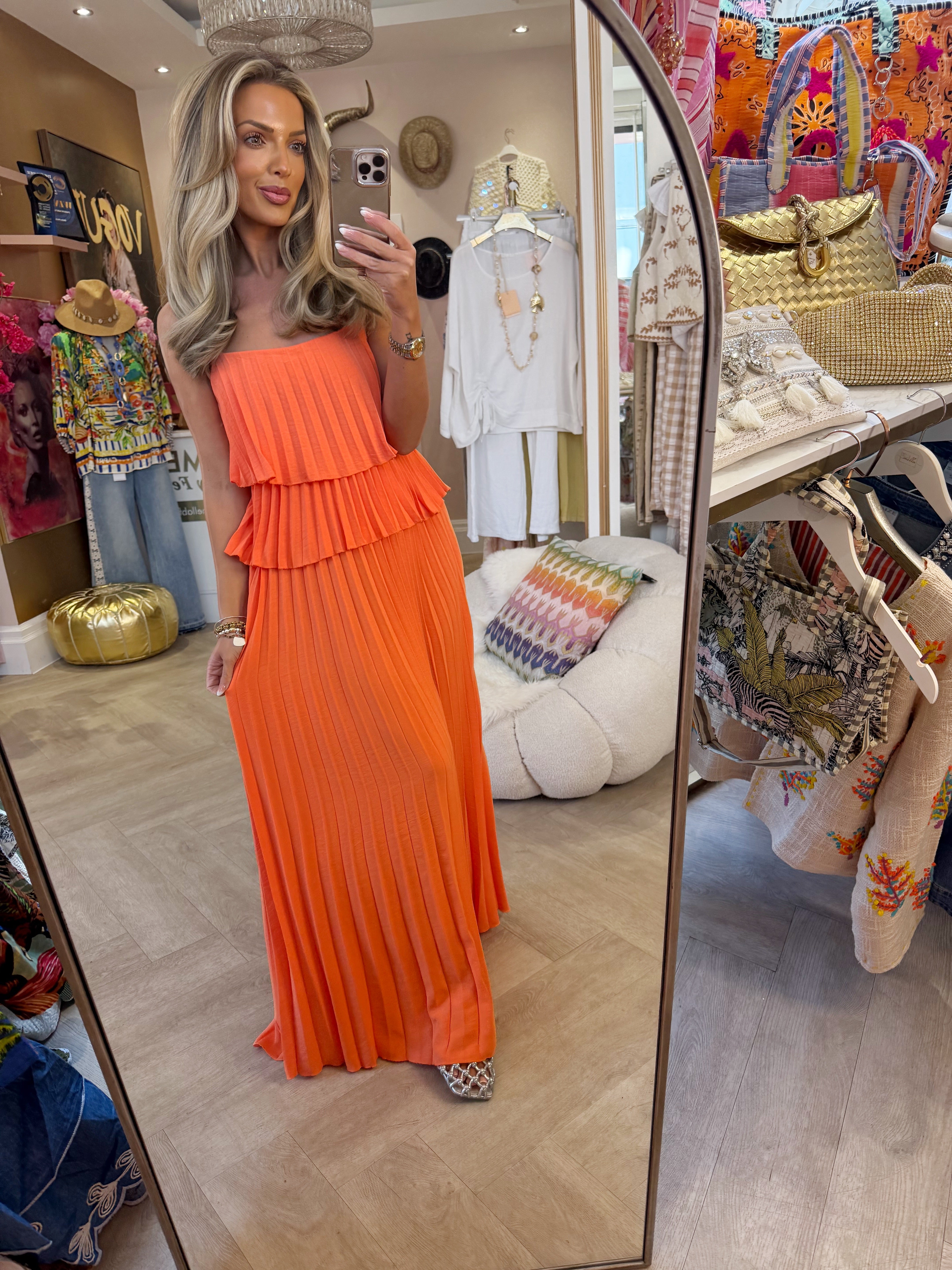 Orange pleated strap maxi is backordered and will ship as soon as it is back in stock.
