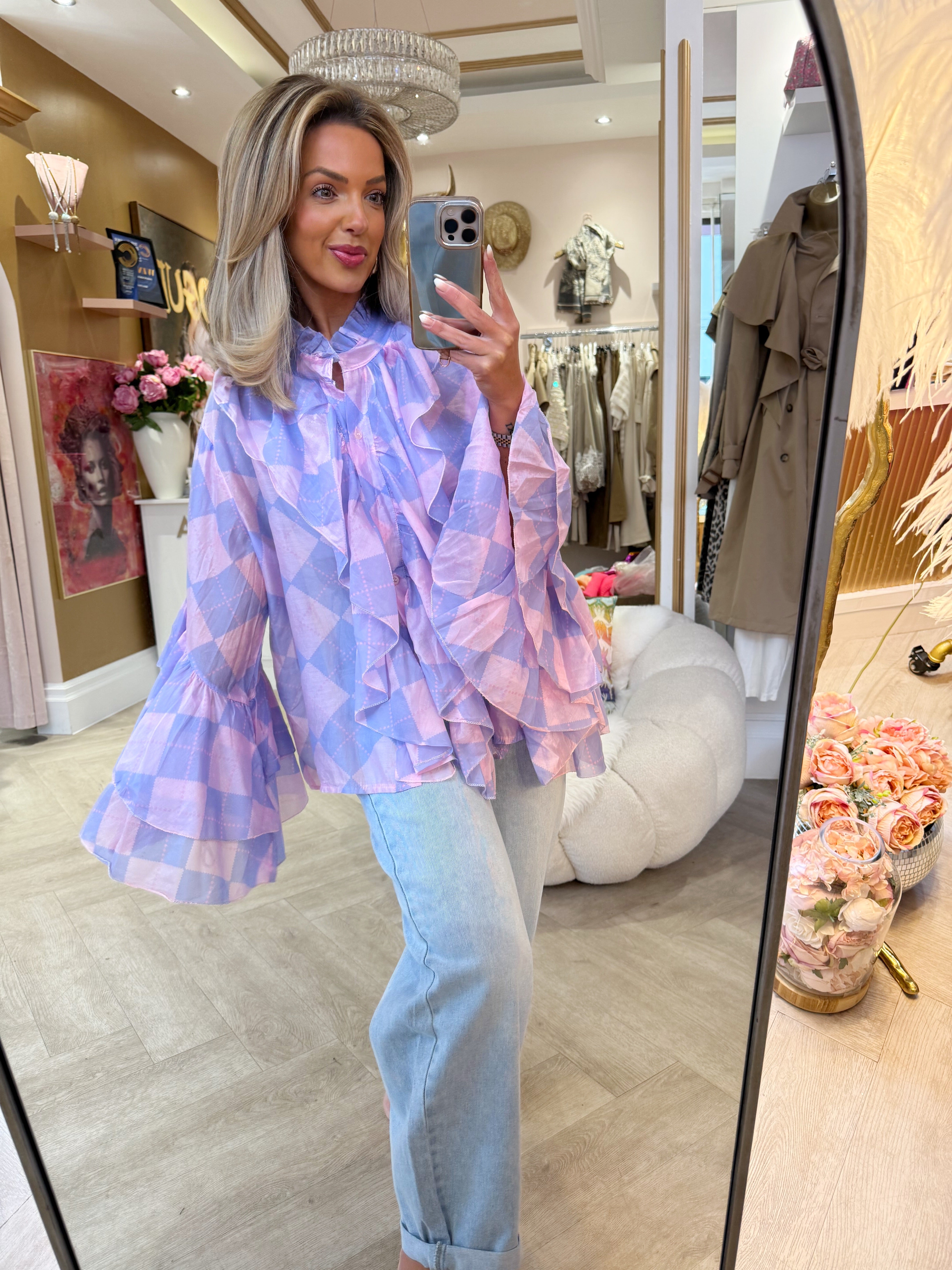 Pink/purple ruffle blouse is backordered and will ship as soon as it is back in stock.