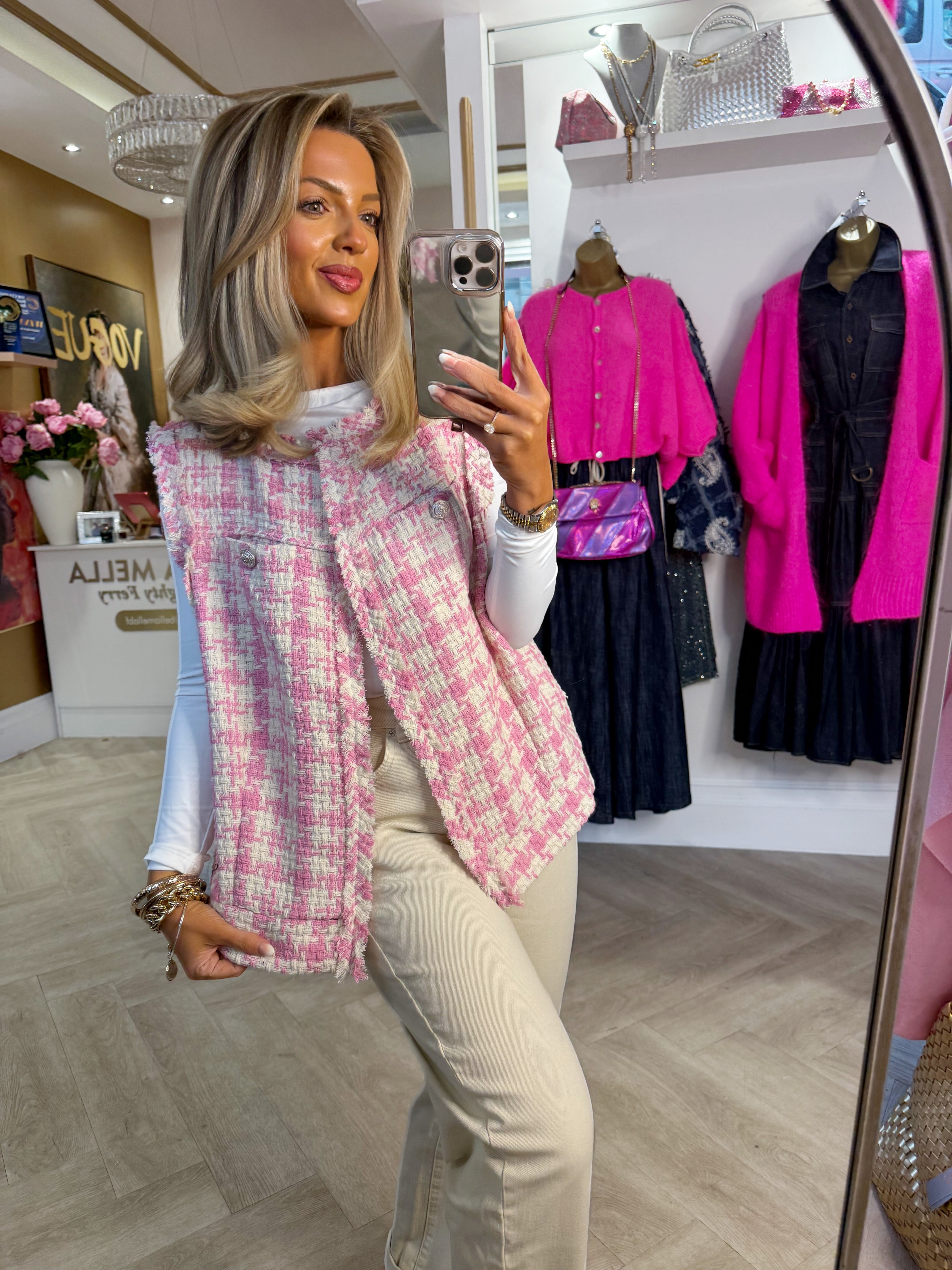 Pink tweed gilet is backordered and will ship as soon as it is back in stock.