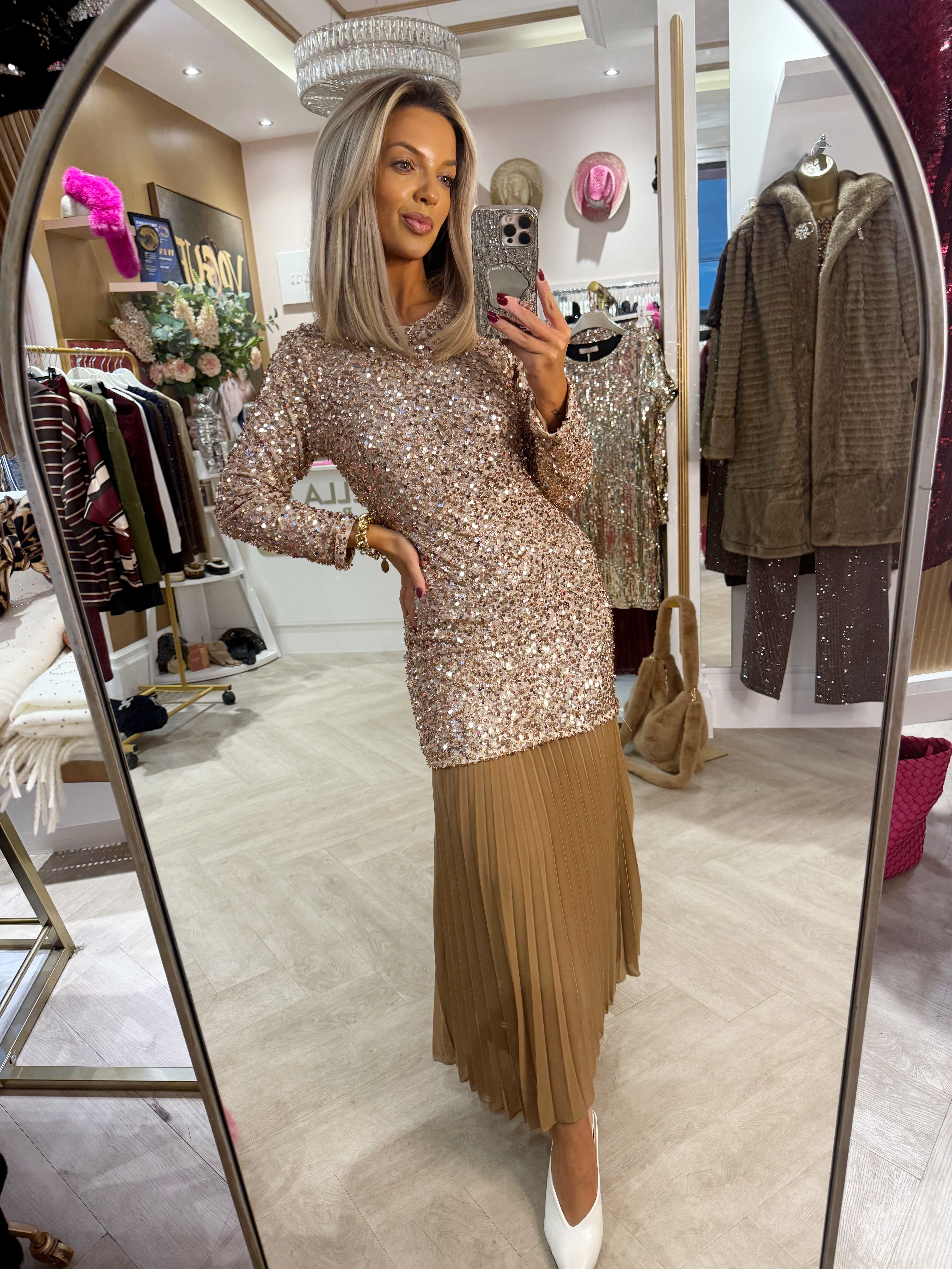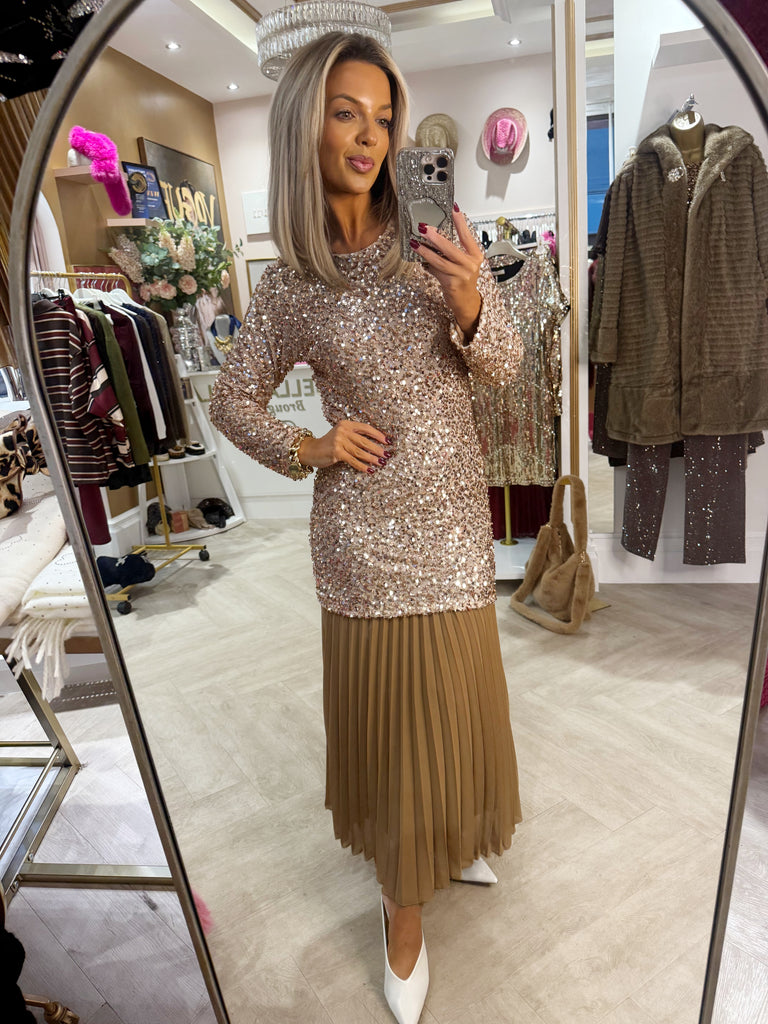 Rose sequin pleated dress is backordered and will ship as soon as it is back in stock.