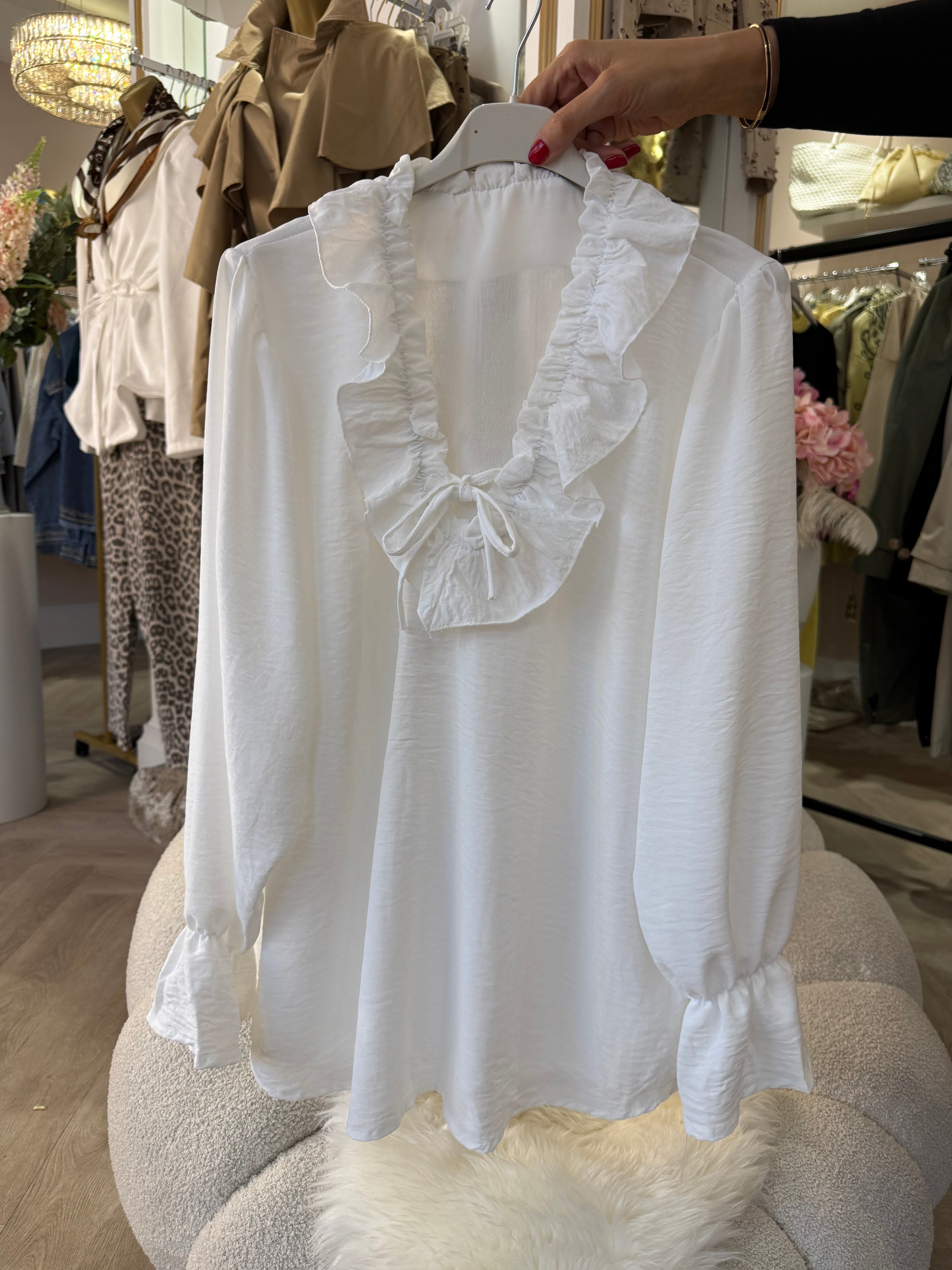 White Ruffle blouse is backordered and will ship as soon as it is back in stock.
